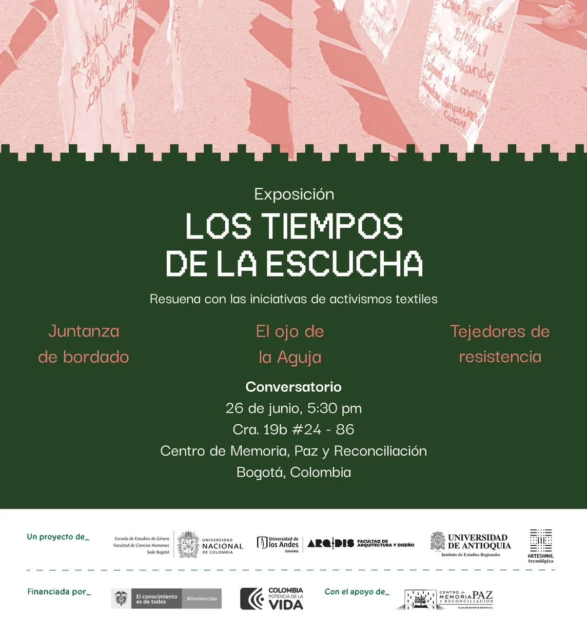 Durante junio 2025, se inauguró una exposición de “Los tiempos de la escucha” en el Centro de memoria, paz y reconciliación en Bogotá. Esta parte de la pregunta fundamental ¿Qué formas tiene la reconciliación? e integra el trabajo de cuatro colectivos textiles conformados por mujeres de Sonsón, Quibdó, Bojayá y Mampuján que durante años han bordado, tejido o cosido, además de sus memorias sobre los daños del conflicto armado, las formas en que imaginan pueden remendarse la vida. En esta ocasión resuenan junto a colectivos urbanos como El Ojo de la Aguja, Tejedores de Resistencia y La Juntanza de Bordado. Iniciativas de activismo textil que fueron protagonistas de las manifestaciones durante la pandemia de COVID-19 y el Estallido Social de 2021. De esta forma, Los Tiempos de la Escucha continúa amplificando las historias y actualizando los desafíos que tenemos en Colombia para vivir la reconciliación y hacer la paz.